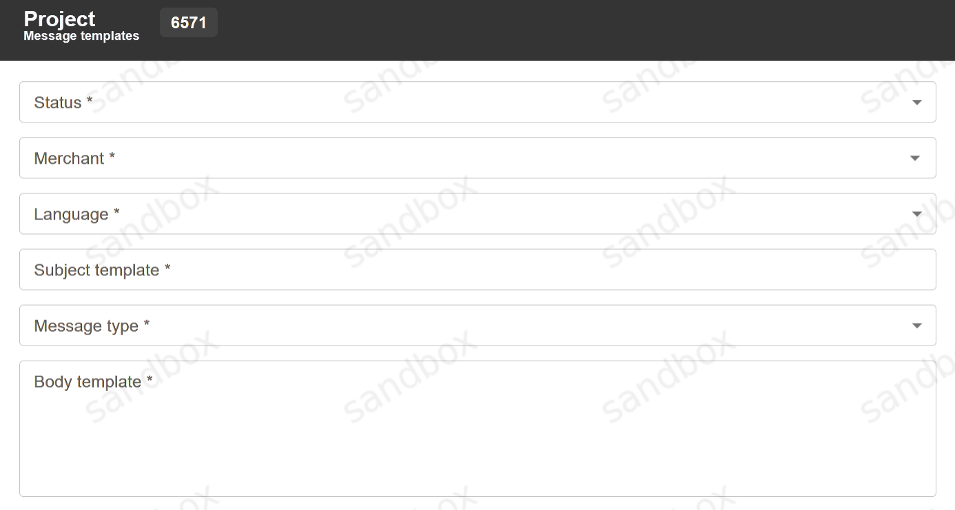 Message templates can be used to send SMS or E-mail messages to customer after each successful transaction. Merchant must provide their message server credentials to Billblend support manager in order to send such messages from merchant address. Templates are created using the Template button. After pressing it, a window with new template details will open: