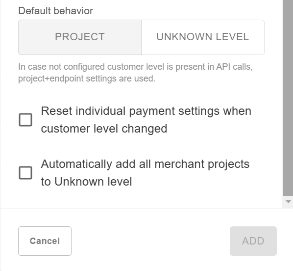 Unknown Level - In case if not configured customer level is present in API calls, Unknown level settings will be used.