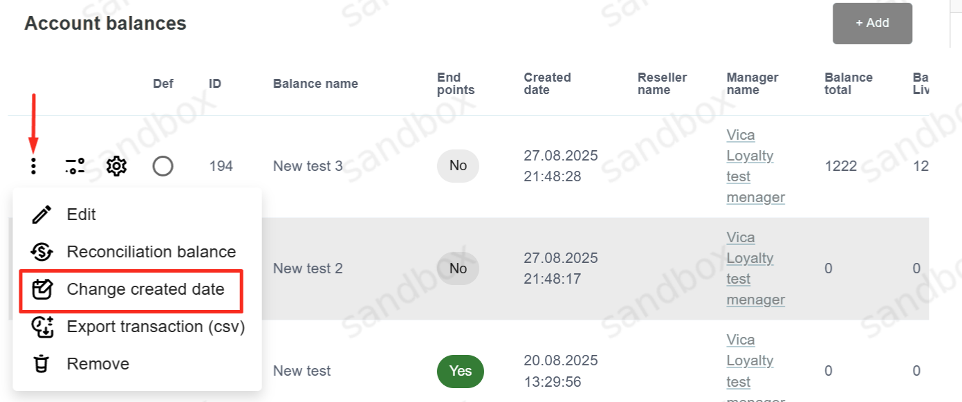 To reconcile balance press 3 dots near balance then Reconciliation Balance button and after Reconcile button: